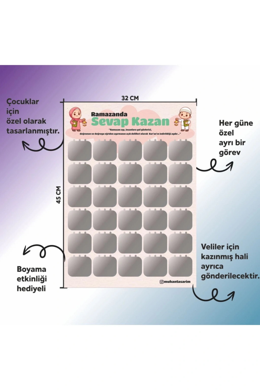 Kaliteli 300gr kalın kuşe kağıt Kazı kazan Poster Boyutu :32; 45 Birbirinden Farklı 30 Etkinlik Çocuğunuza Ramazanı Sevdirmek Artık Çok Kolay Yanında Veliler için A4 boyutunda Etkinliğin Kazınmış Hali Gönderilecektir; Boyama Etkinliği yanında hediye olarak gönderilecektir;