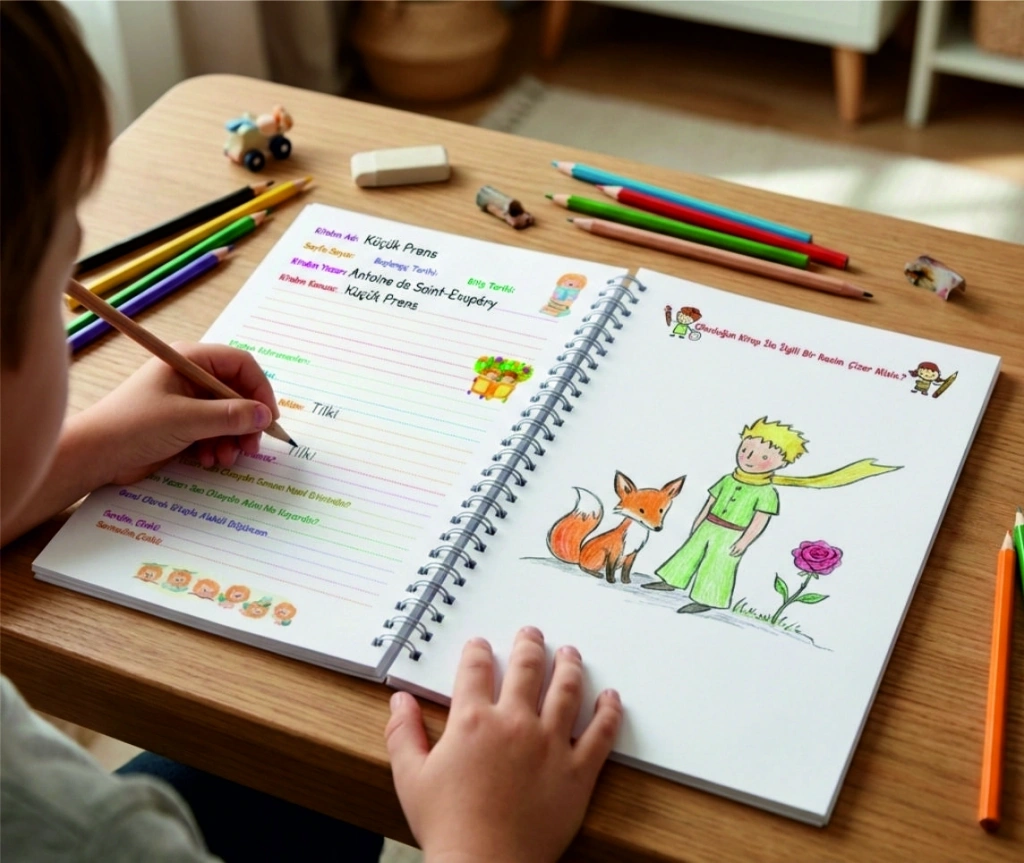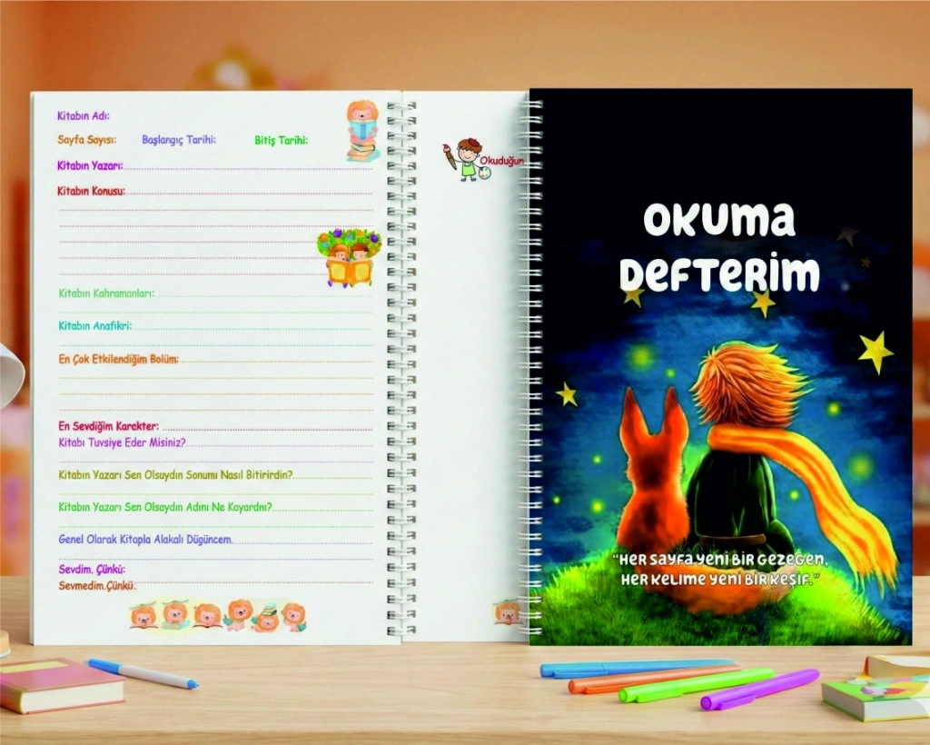 Çocuklar Kitap Okumayı Bu Defterle Çok Sevecek! Çocuklara kitap okuma alışkanlığı kazandırmak hiç bu kadar keyifli olmamıştı. Özel olarak tasarladığımız bu okuma defteri, çocuğunuzun okuduğu her sayfayı yeni bir keşfe dönüştürüyor. İçerisindeki yönlendirici sorular sayesinde çocuklar okuduklarını daha iyi anlıyor, ana fikri kavrıyor ve kitap hakkındaki düşüncelerini kendi cümleleriyle kağıda döküyor. Sağ sayfadaki geniş boşluk ise, hikayenin onlarda bıraktığı izi rengarenk boyalarla çizebilmeleri için ayrıldı. Hem okul dönemi hem de tatiller için harika bir gelişim dostu!